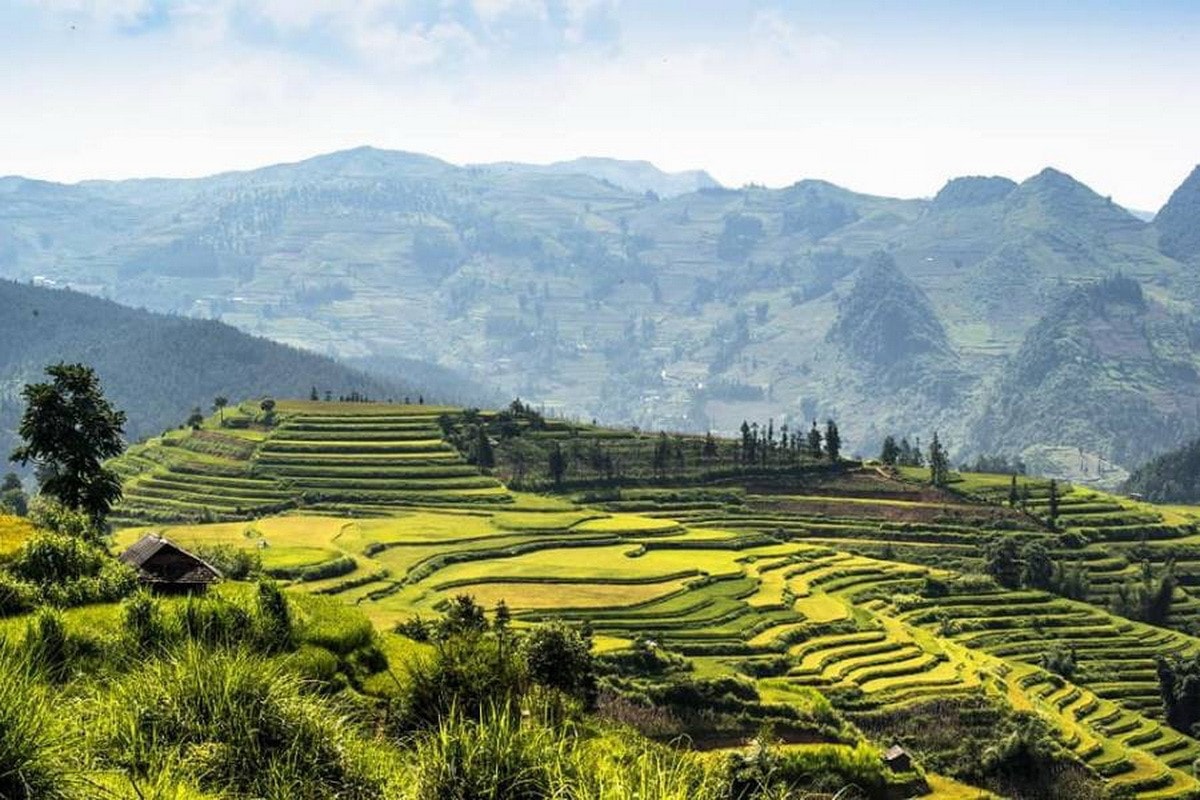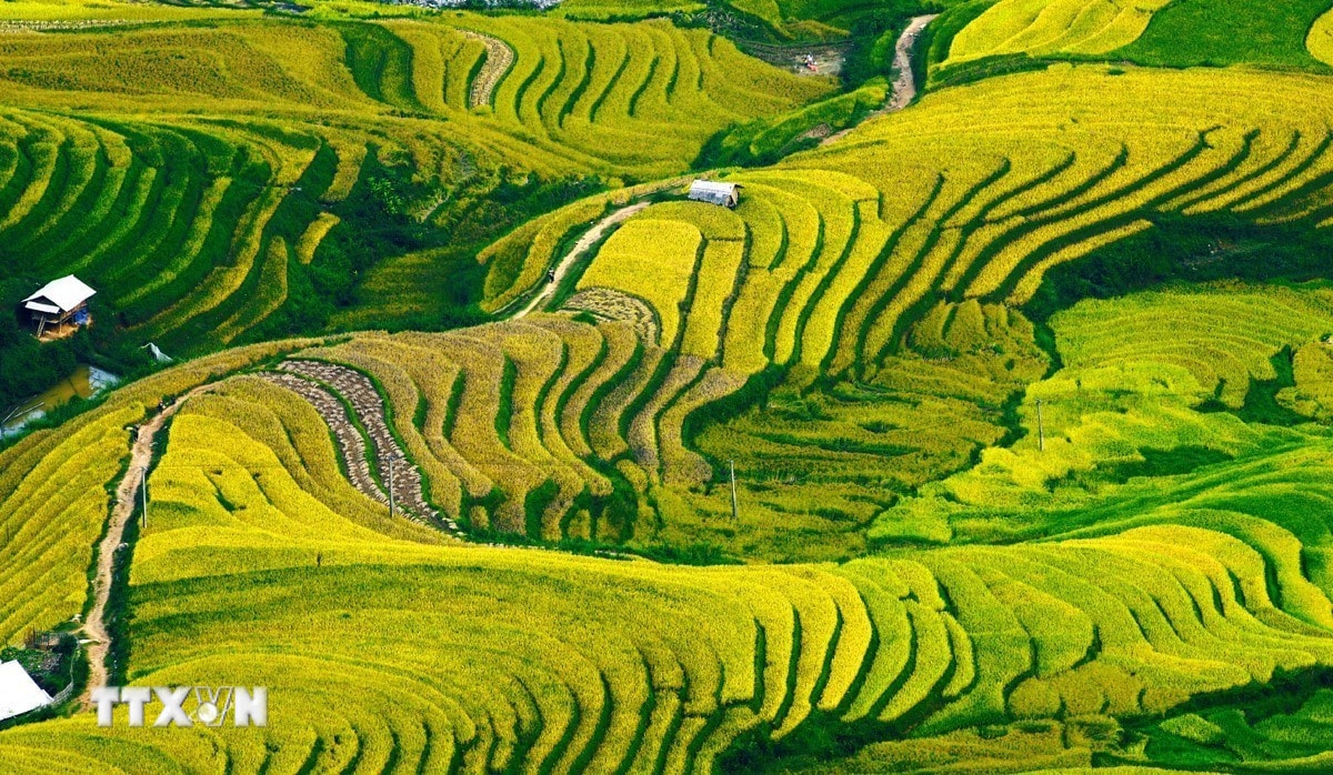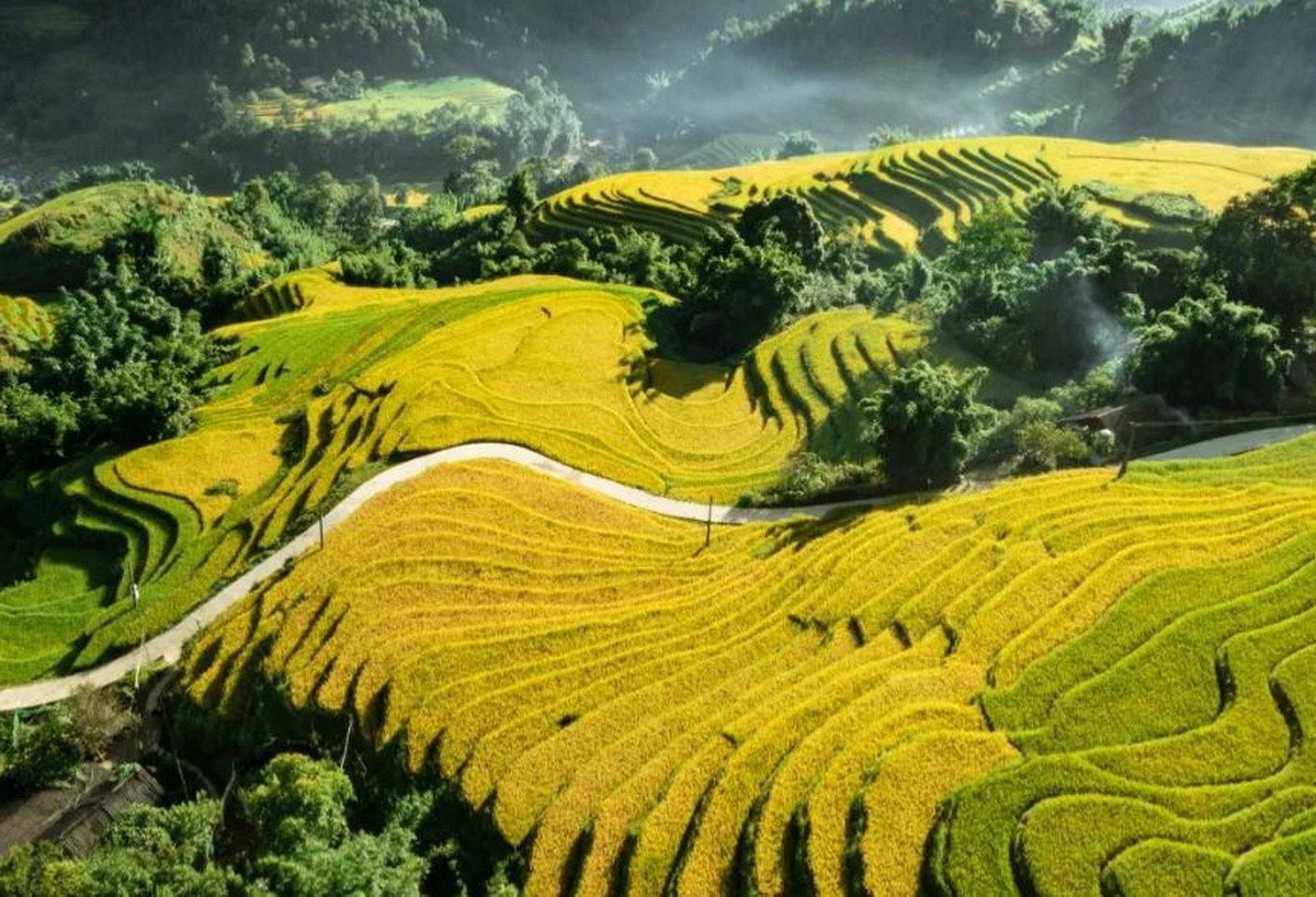 Vào mùa lúa chín, những thửa ruộng phủ một màu vàng óng ánh dưới nắng thu, trải dài từ chân núi đến tận mây trời. Các lớp ruộng xếp tầng tầng lớp lớp như sóng lúa, mang lại cảm giác choáng ngợp, kỳ vĩ.